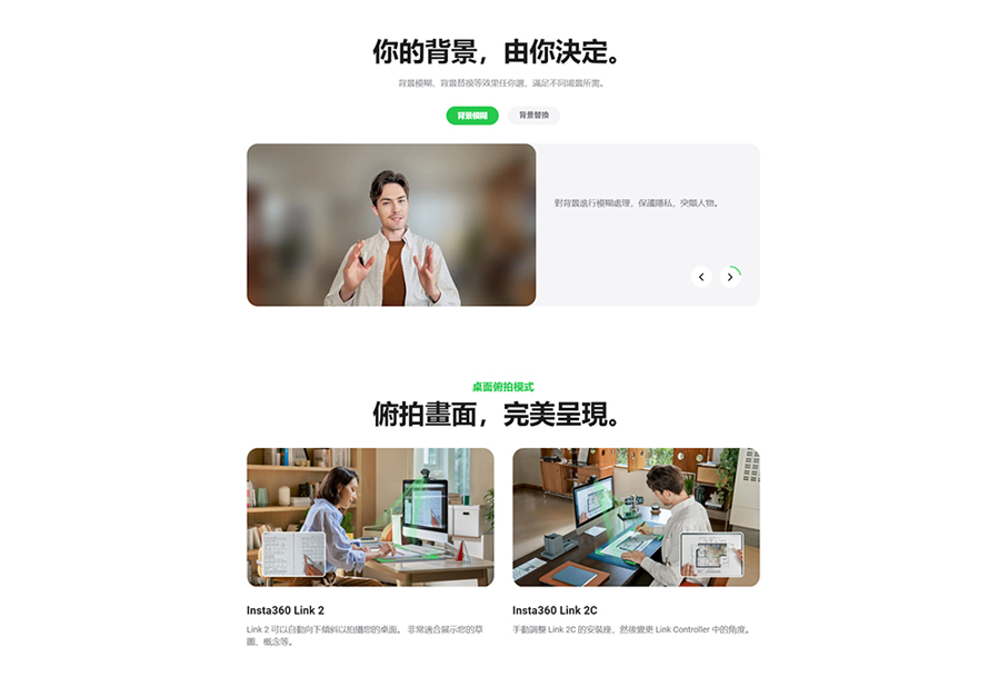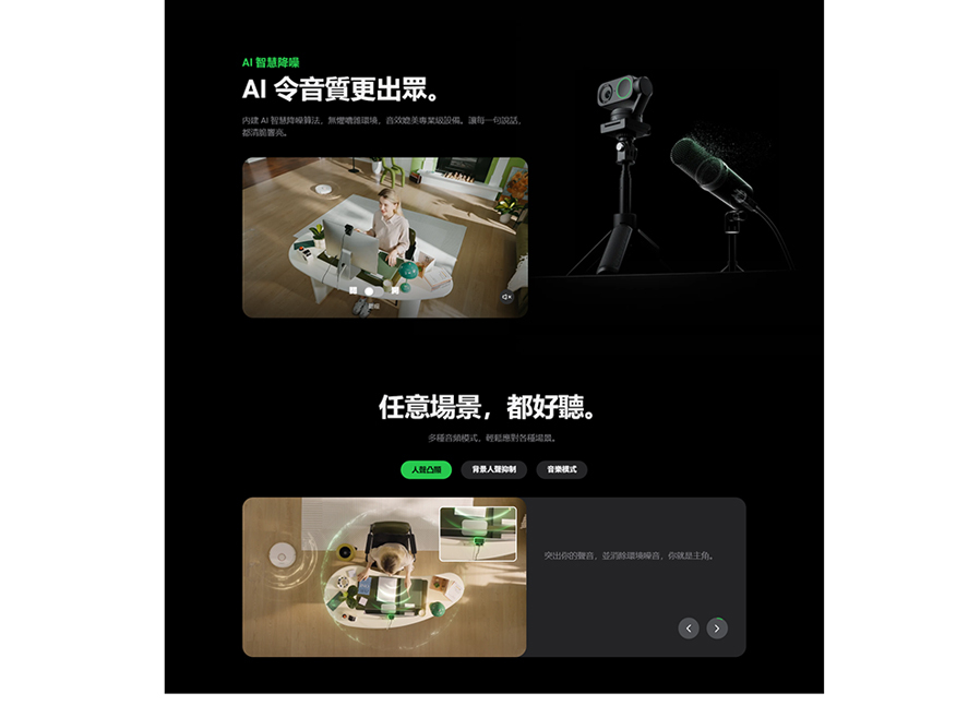 噪音消除。 憑藉全新的磁吸支架和人工智慧追蹤、自動取景、手勢控制、可自訂背景和自然模糊等